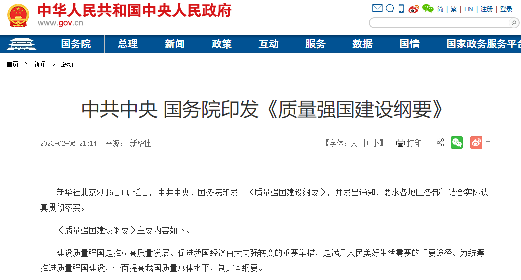 近日,中共中央、國務院印發(fā)了《質量強國建設綱要》,并發(fā)出通知,要求各地區(qū)各部門結合實際認真貫徹落實。